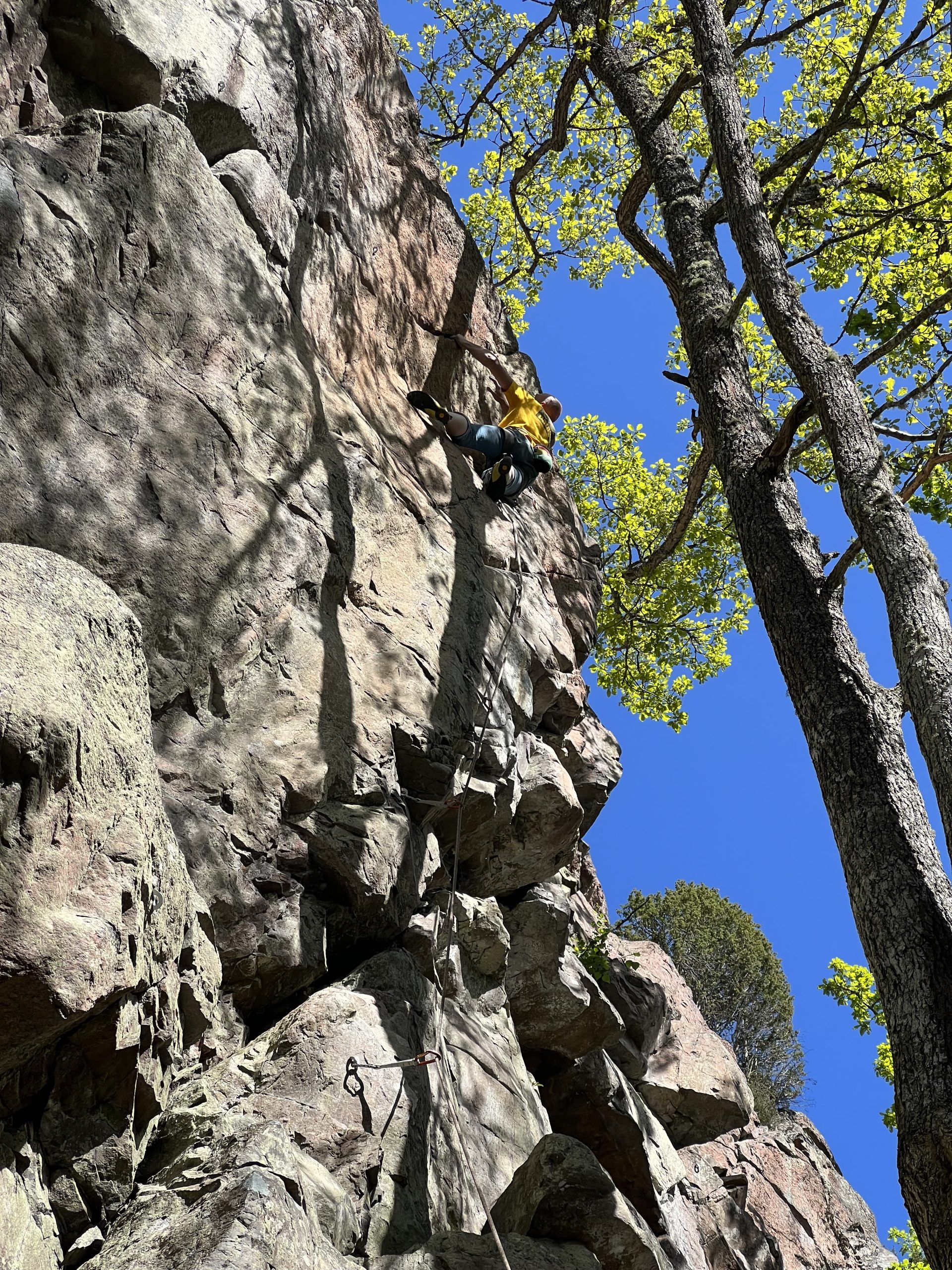Silverberget levererade idag. Härlig klättring på välrensade leder av Björn Holst och Tove från Västerviks klätterklubb. Nytt toppankare sattes upp på leden Nadir. Träden som man tidigare säkrade i har blåst omkull.